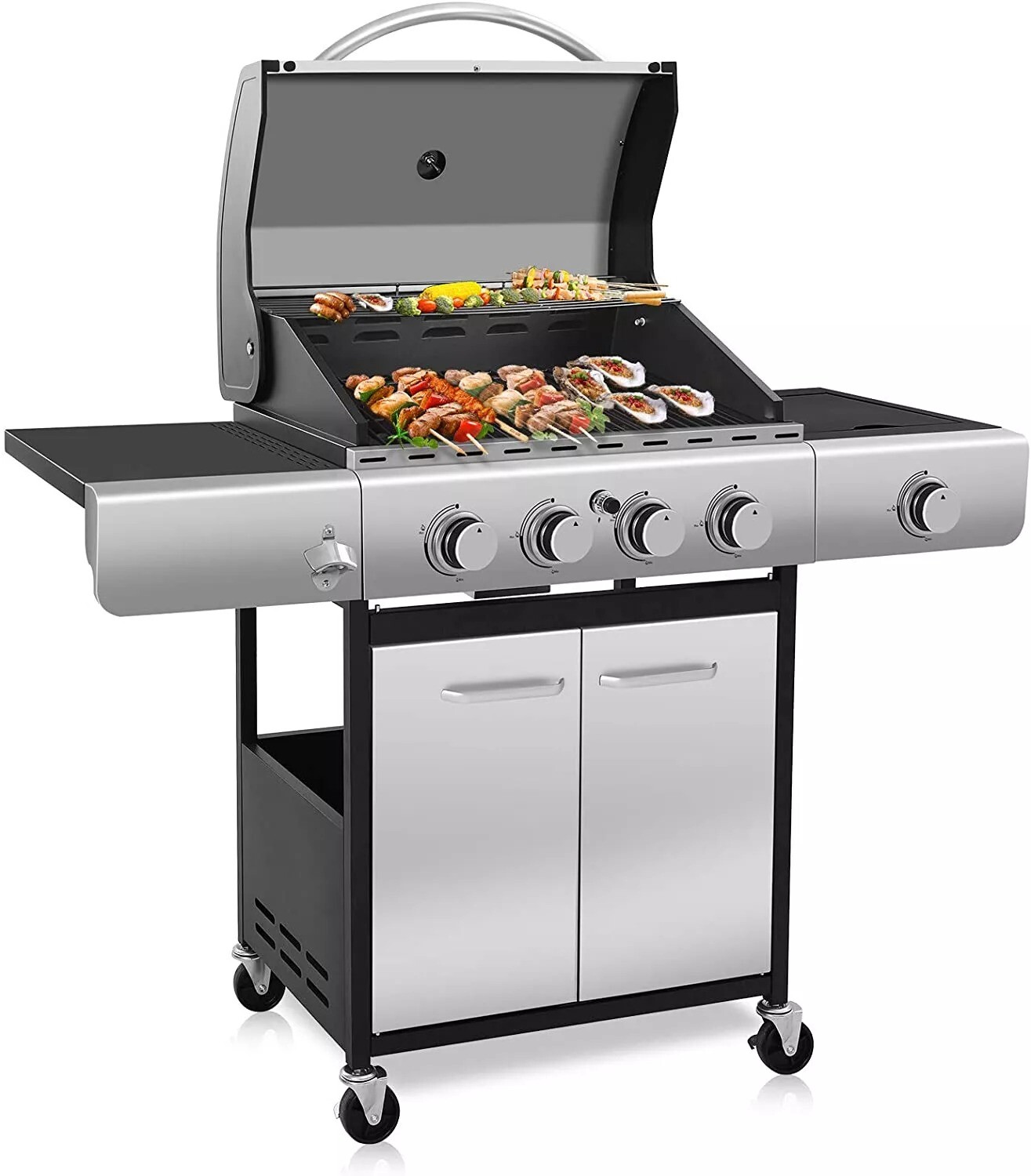 Thermometer in the lid,it can tell you the temperature of the food in the grill,easy to know when you could taste the wonderful food.With 2 infinitely adjustable stainless-steel burner, 10000 BTU for each.2pcs of knob can let you cook more foods with different fire power,simple and efficient for you to cook more food very quickly,you don’t have to waste more time for waiting foods,just enjoy the wonderful meal.